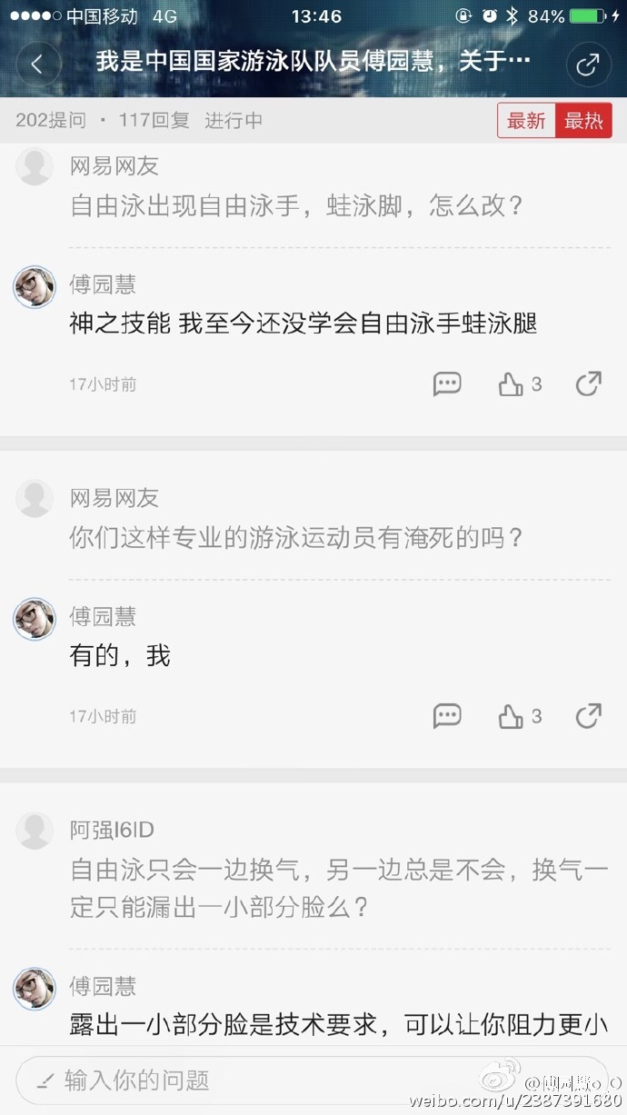 傅园慧:已经是最好成绩了。我用了三个多月去做恢复,鬼知道我经历了什么,真的太辛苦了,有时候我都觉得我快要死了,我当时的训练真是生不如死,但今天的比赛我已经心满意足了。